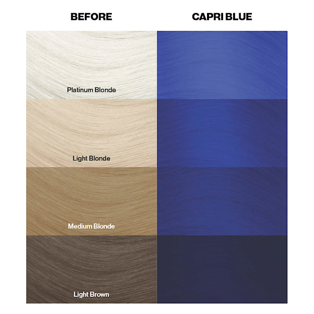 Crazy Color Capri Blue is a powerful electric blue. To achieve stunning electric blue hair, apply to hair that has been pre-lightened to level 9 or 10 (blonde) before use. It is also suitable for level 8 (light brown) hair, but results will only be tonal.