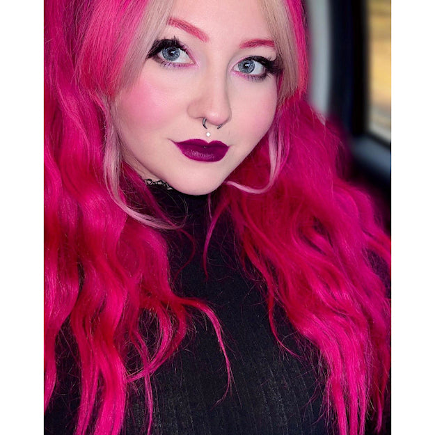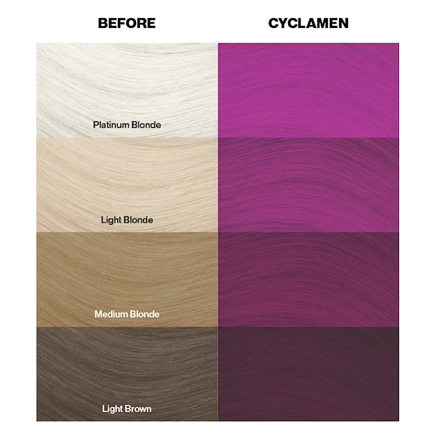 Crazy Color Cyclamen is an intense deep pink which will give you a vibrant, saturated colour. For the best results, apply to hair that has been pre-lightened to level 9 or 10 (blonde) before use. It is also suitable for level 8 (light brown) hair, but results will only be tonal.
