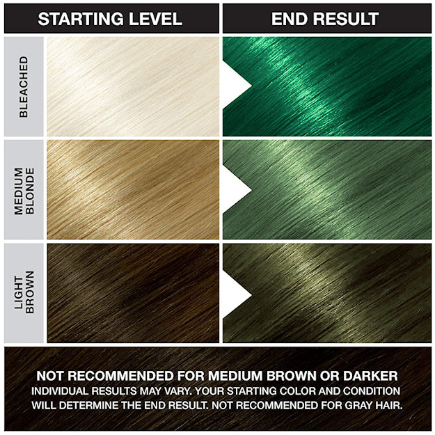 Really vivid green, works well on the medium blonde base even though the picture guide states it doesn't. Only thing I dislike is the staining! Even after multiple washes, stains shower walls, loose hairs that fall on surfaces end up stained. Unlike other Punky colours!